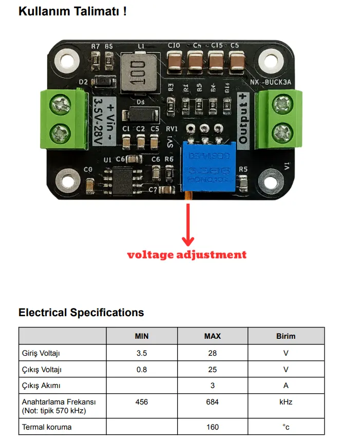 NX-Buck3A Trim, yüksek verimli bir DC-DC buck konvertör kartıdır. 3A’e kadar çıkış akımı sağlayabilen kompakt yapısı ile gömülü sistemler, IoT cihazları ve endüstriyel projeler için güvenilir ve kararlı bir güç çözümü sunar.